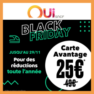 Jusqu’au 29/11/2021, profitez de l’offre Black Friday Oui SNCF sur la carte Avantage et voyagez toute l’année à prix réduit. La carte Avantage est en promotion à seulement à...