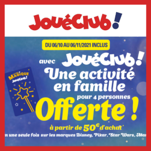 En ce moment et jusqu’au 06/11/2021, JouéClub vous offre une activité en famille pour 4 personnes dès 50 € d’achat parmi les marques Disney, Pixar, Star Wars et Marvel....