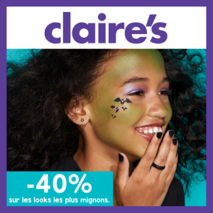 En exclusivité sur le site Claire’s, bénéficiez d’une réduction de 40 % sur plus de 8 000 articles : accessoires halloween, bijoux, sacs à dos, maquillage, … Cliquez sur...
